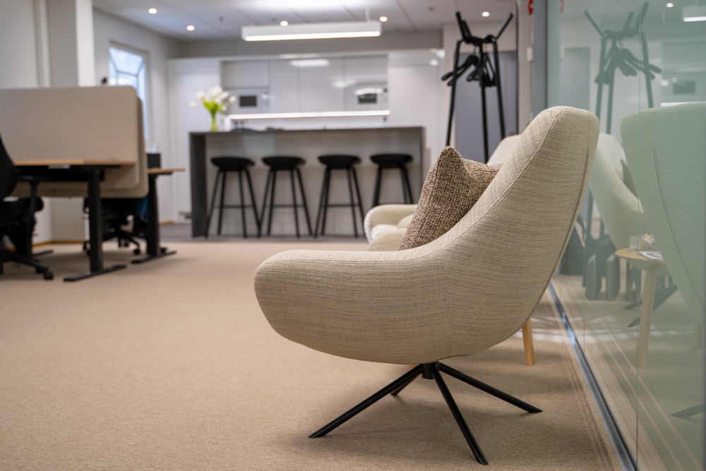 Uudessa toimistossa hyödynnettiin pitkälti tilan edellisen käyttäjän ratkaisuja, kuten työpöytiä. Remontteja tilaan ei tarvinnut ennen muuttoa tehdä, sillä toimisto oli uudistettu vain vajaat kaksi vuotta aikaisemmin neutraalin tyylikkäin värein.
