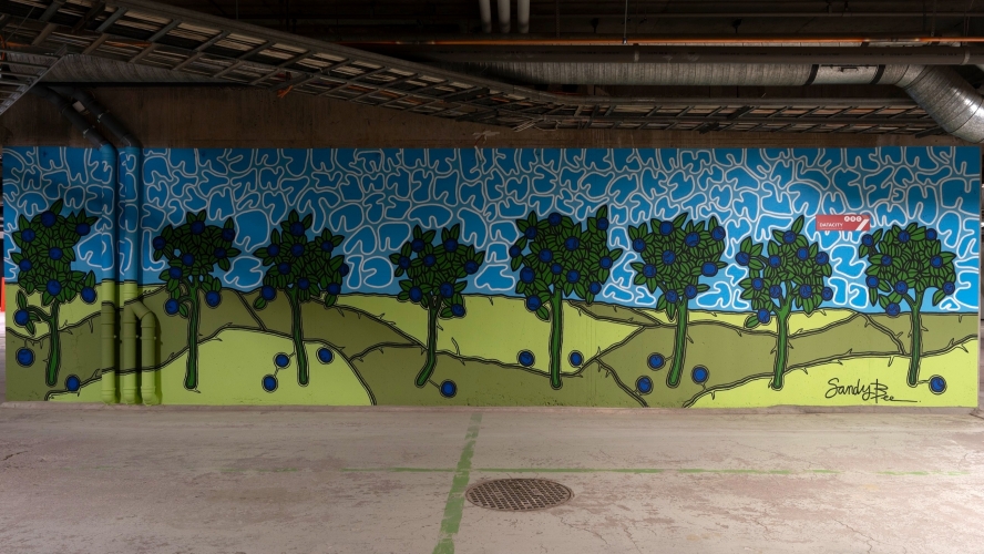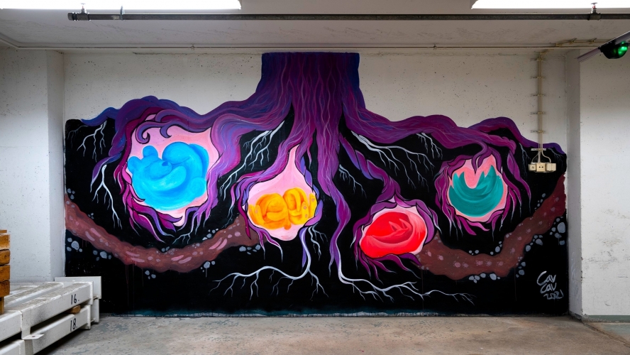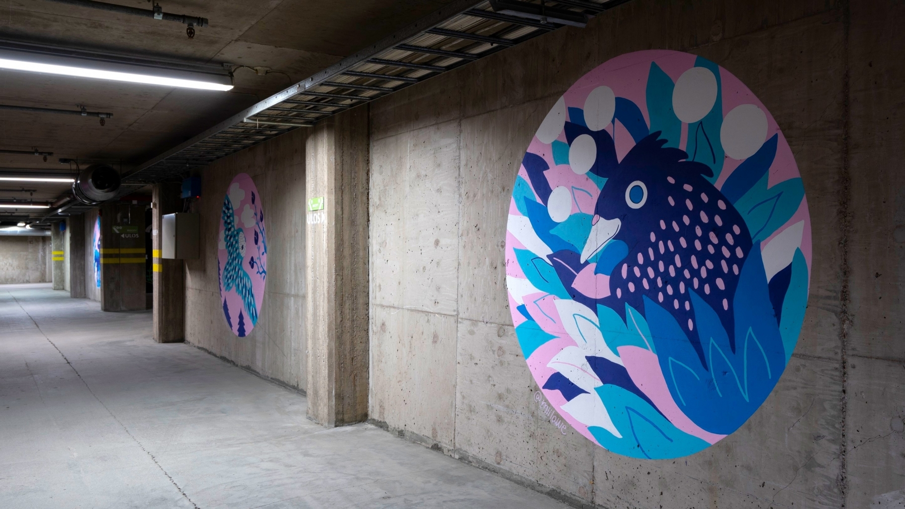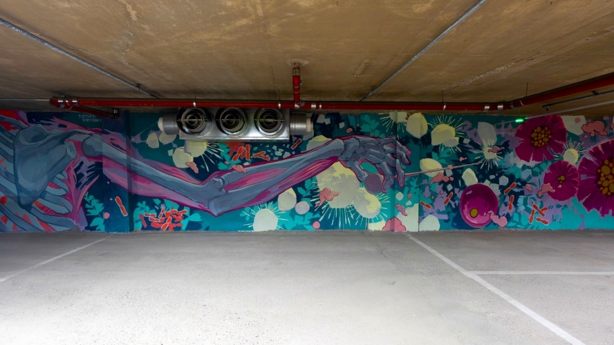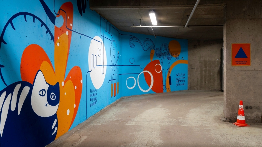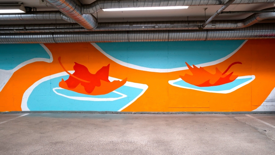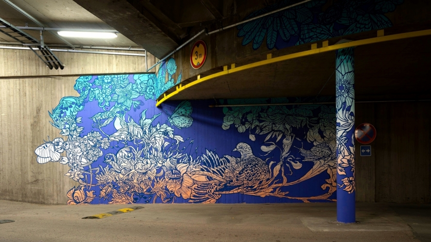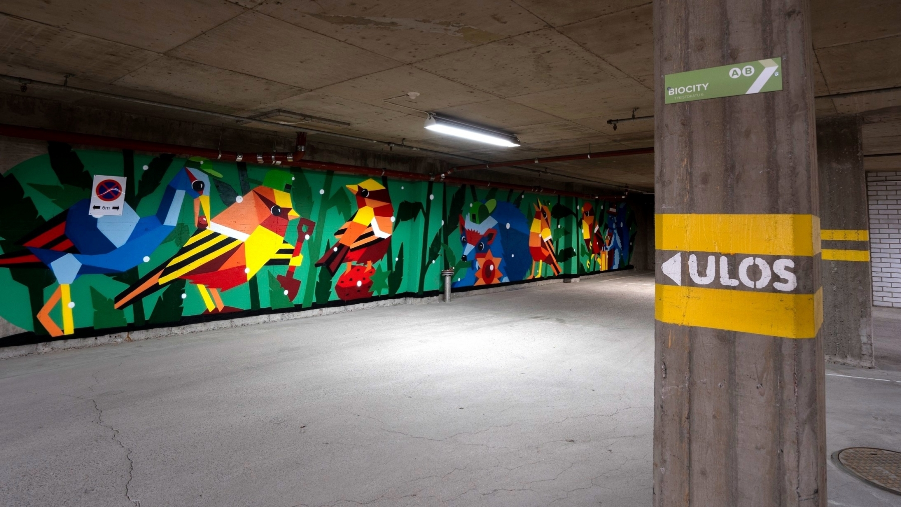 Turkulaiskatutaiteilija Jukka Hakasen maalaama Maanalainen puutarha luo kirkkaan ja piristävän keitaan pysäköintihallin seinälle.