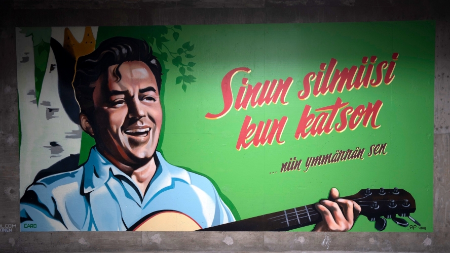 Kustom kulture -henkisessä maalauksessa kesäinen Olavi Virta laulaa ja soittaa kitaraa kenties herättäen musiikillisia muistoja katsojassa.