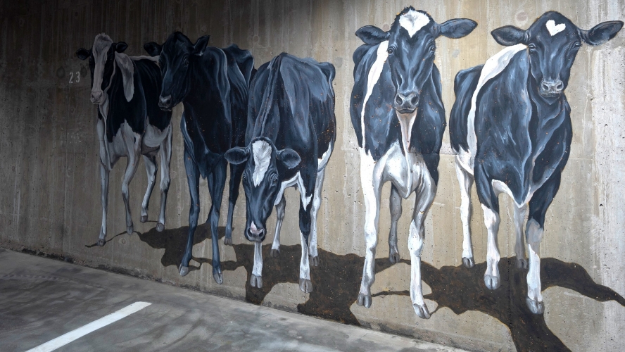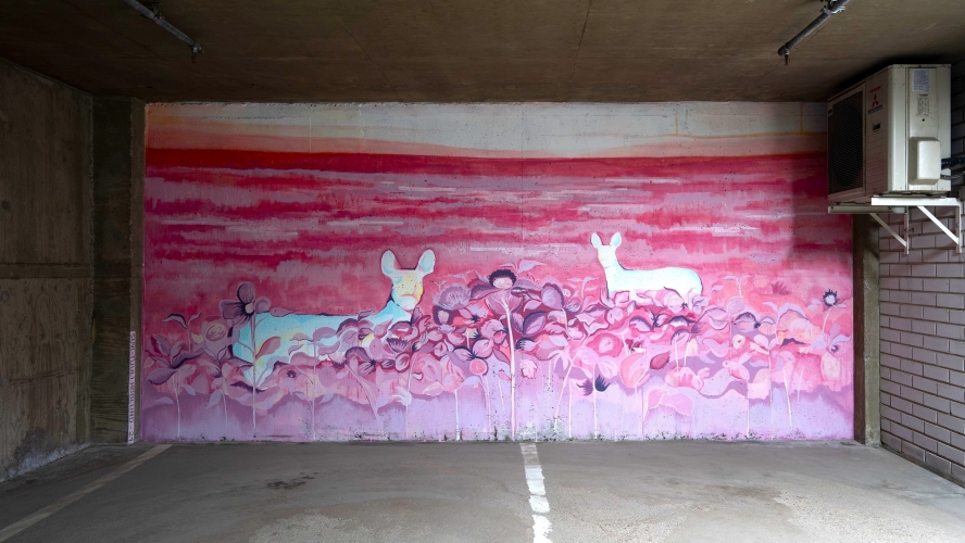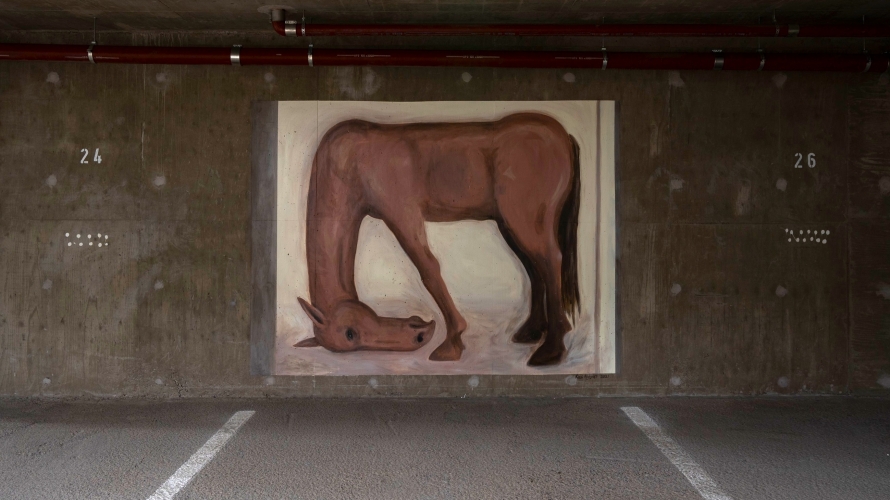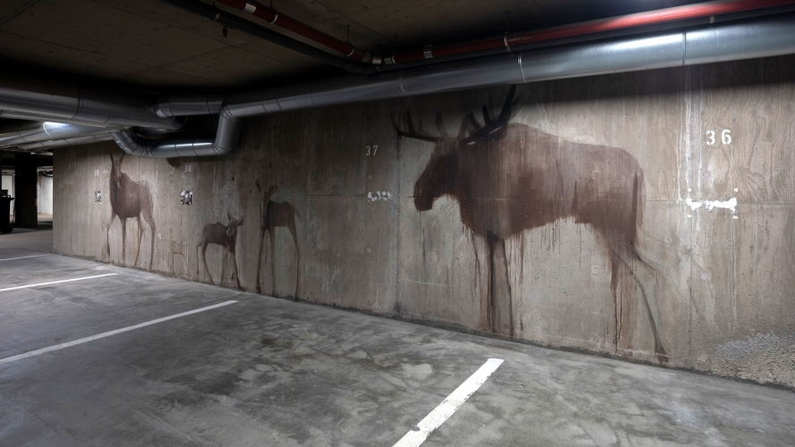 Kuten luonto, myös luonnosmaisesti maalattu hirviperhe mukautuu vallitseviin olosuhteisiin sulautuen parkkihallin seinälle kalliomaalauksen tapaan.