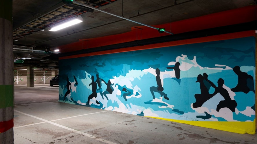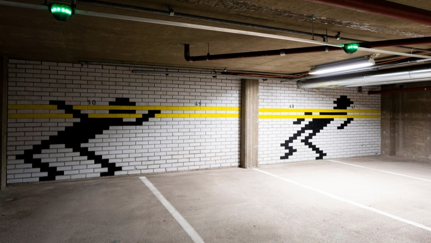 Limbo-seinämaalaus hyödyntää tiiliseinän pintastruktuuria ja muurauskuviota sekä luo jatkumoa parkkihallien pilareissa olevalle huomioviivoitukselle.