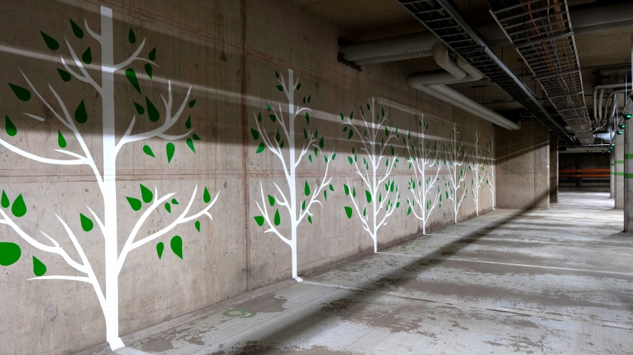 Parkkiruutujen viivat jatkuvat seinälle muodostaen keväisen koivurivistön, joka selkeyttää auton pysäköimistä oikeaan kohtaan.