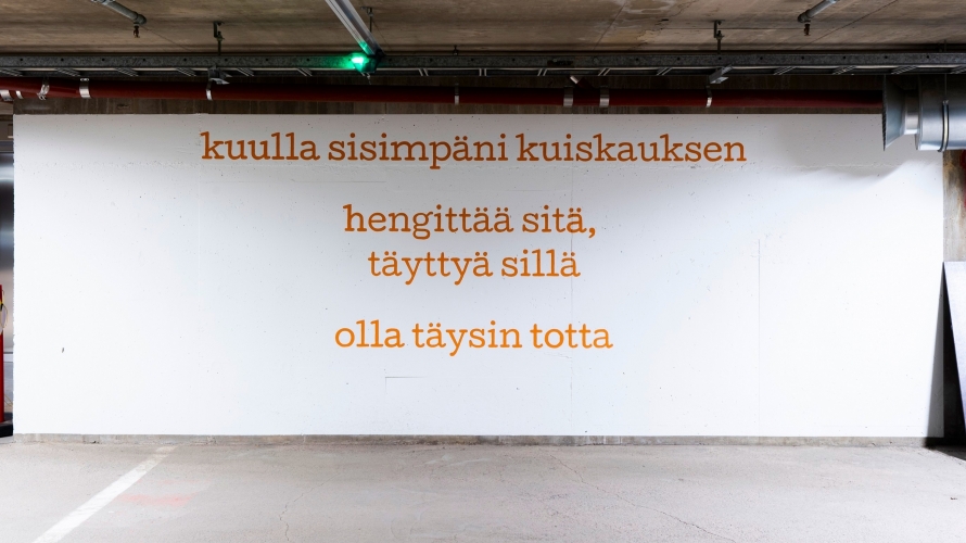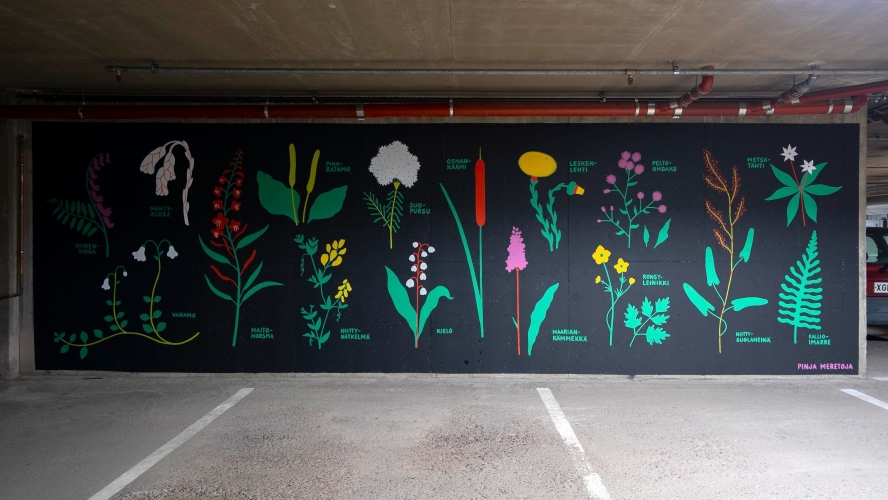 Pysäköintilaitoksen sisäänajoväylää vierustavaan Salainen puutarha -muraaliin on valikoitu eliölajeja uhanalaisuutta mittaavasta Suomen lajien punaisesta kirjasta.