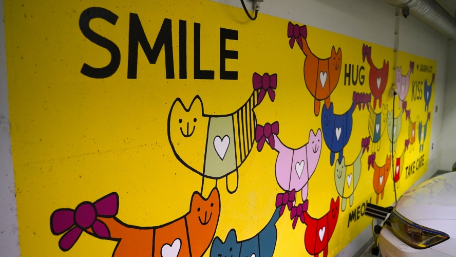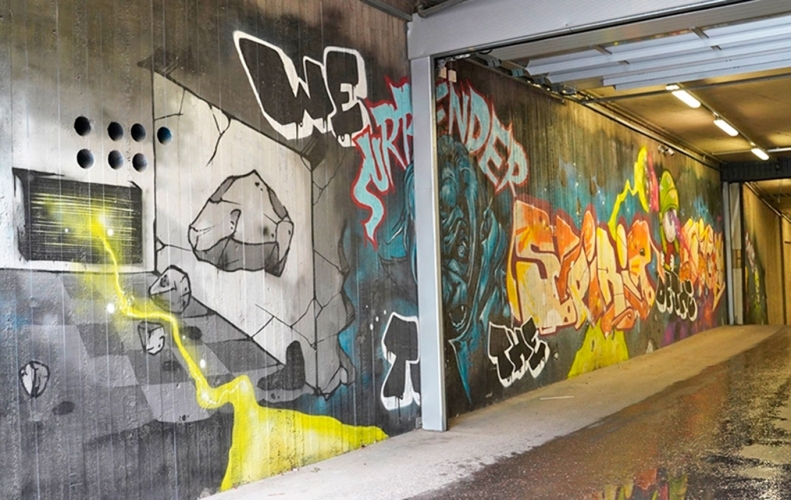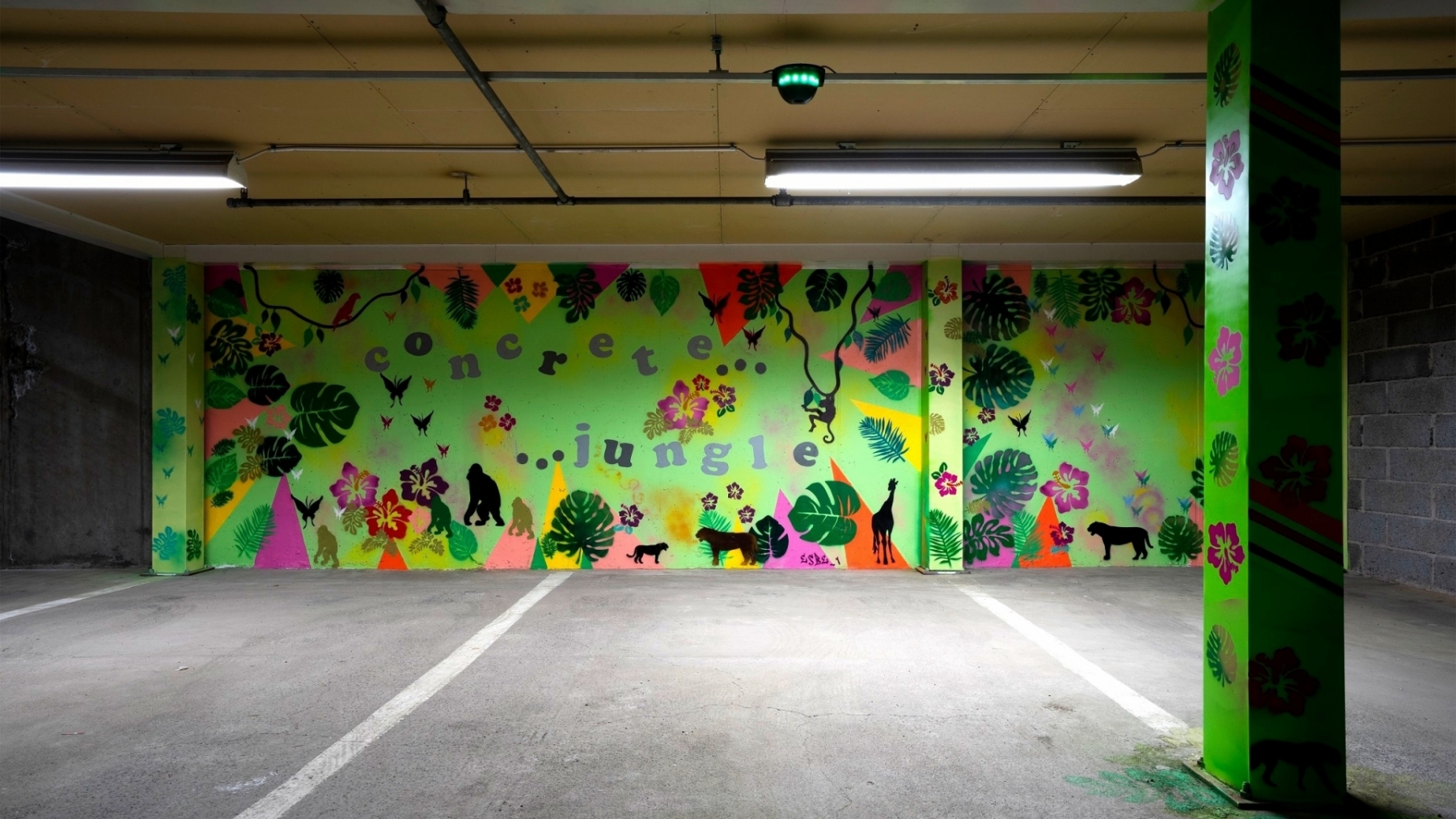 Seinämaalaus tuo harmaaseen tilaan väriä ja leikittelee betoniviidakko-ajatuksella. Viidakkoteema jatkuu seinältä lattialle ja läheisiin pylväisiin.