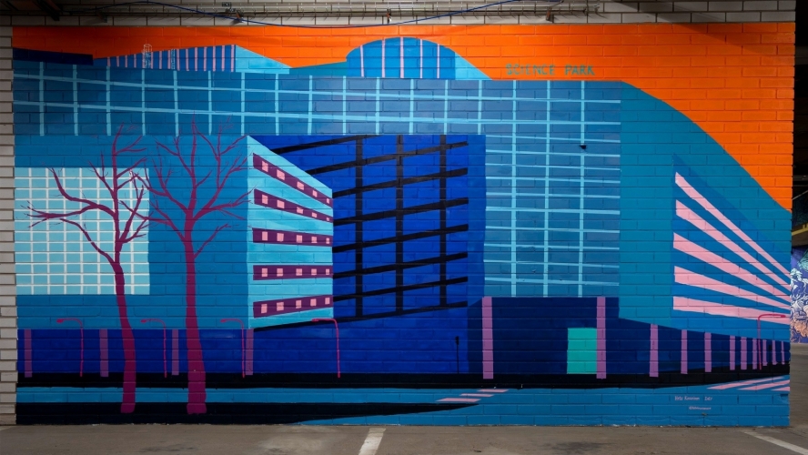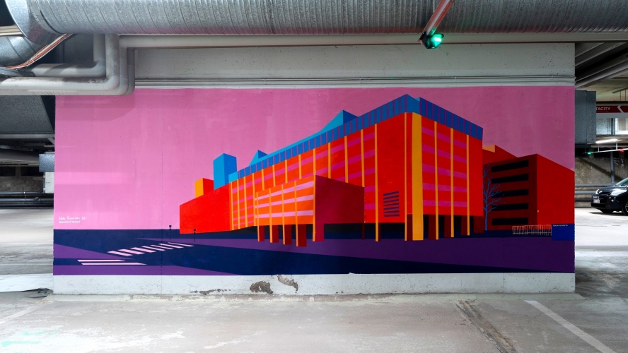 BioCityn pysäköintihallista löytyvässä seinämaalauksessa BioCity-rakennus on kuvattu pirtein värein ja tyylitellyin linjoin.