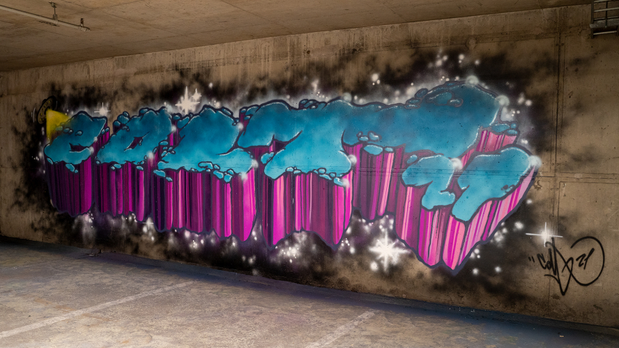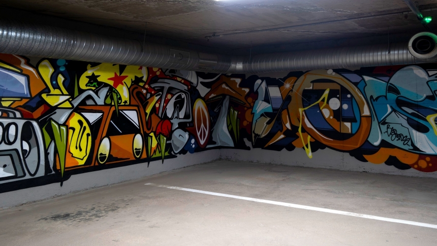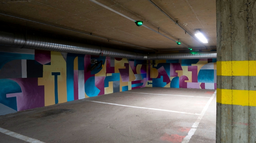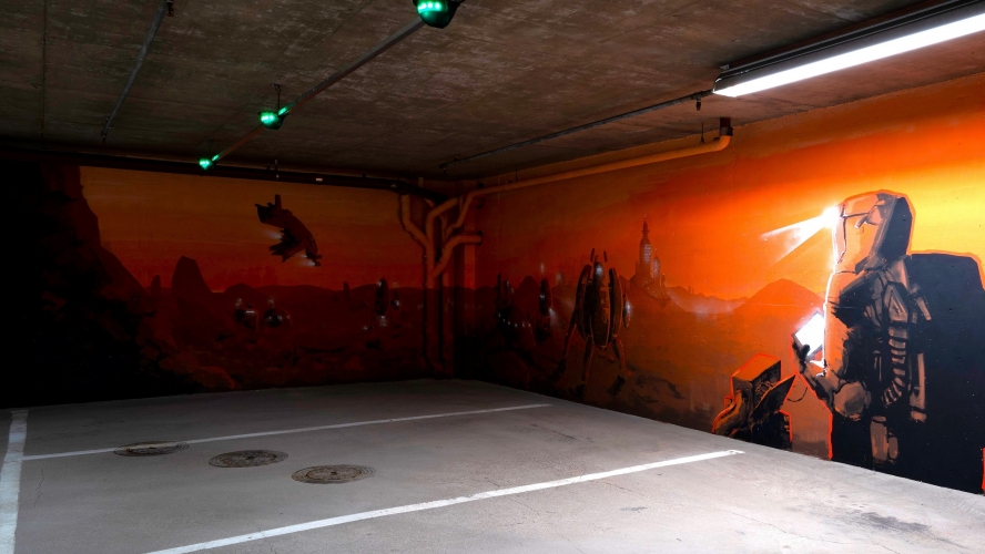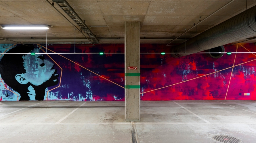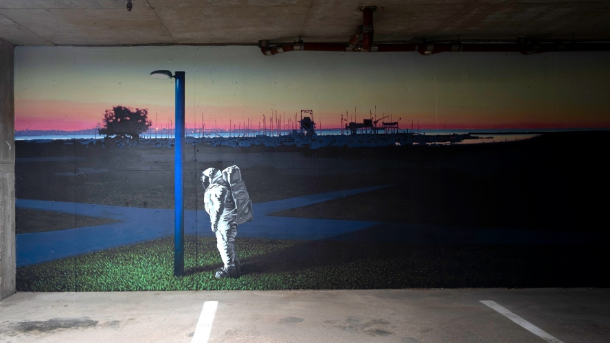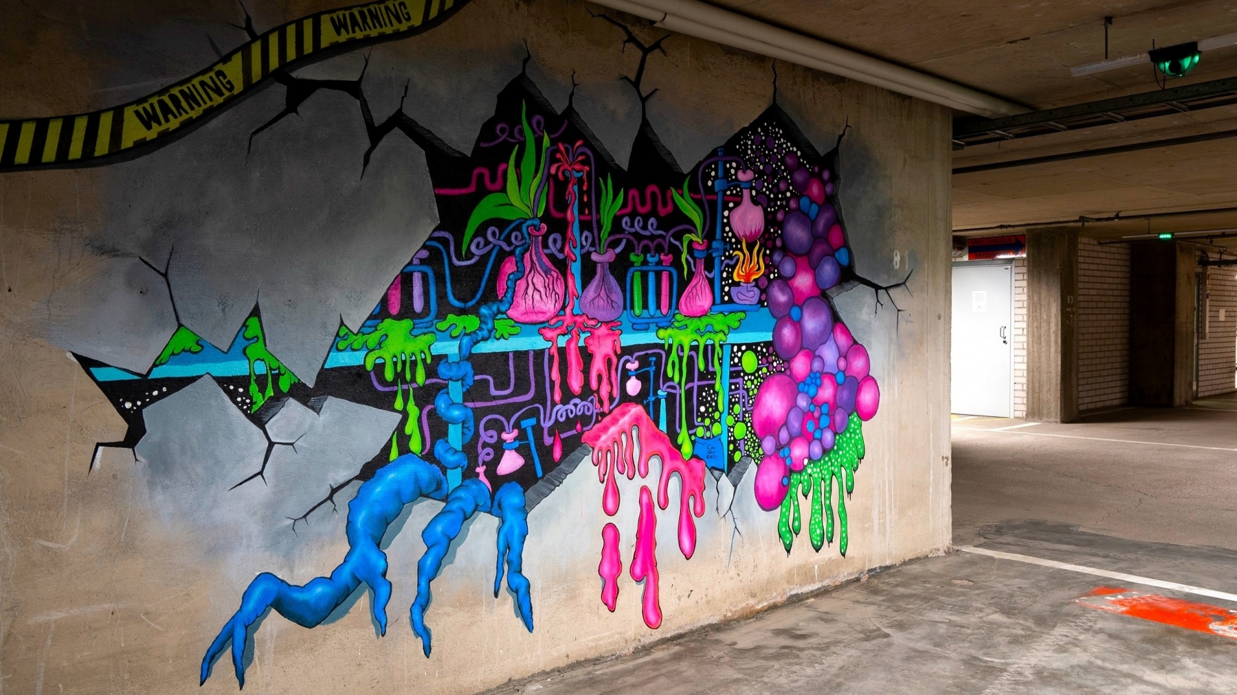 Turkulaisen graffititaiteilijan Salim Sheikhin avaruusteemainen teos ammentaa katutaiteen perinteestä ja tuo värikylläisyyttä pysäköintihalliin.