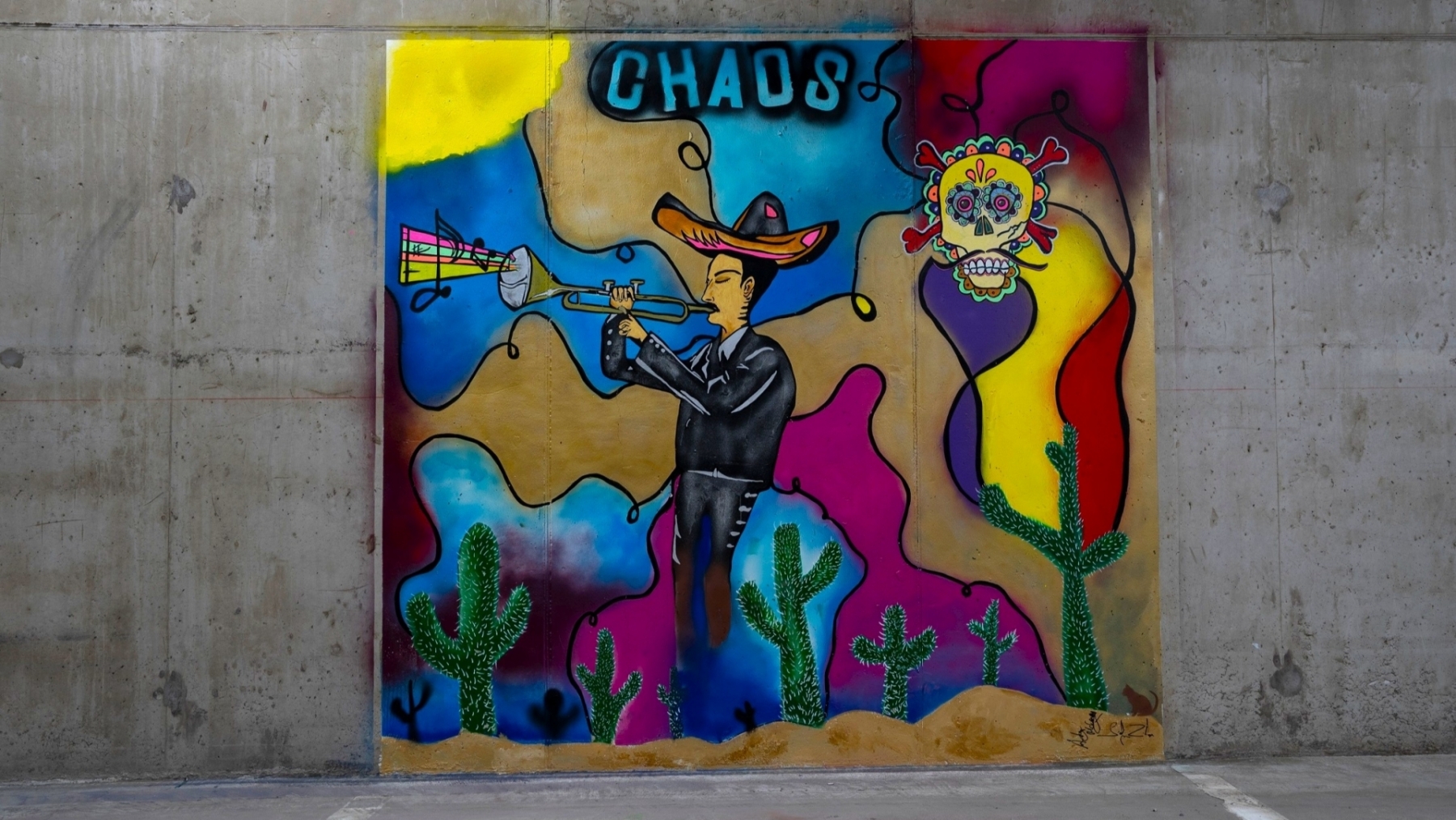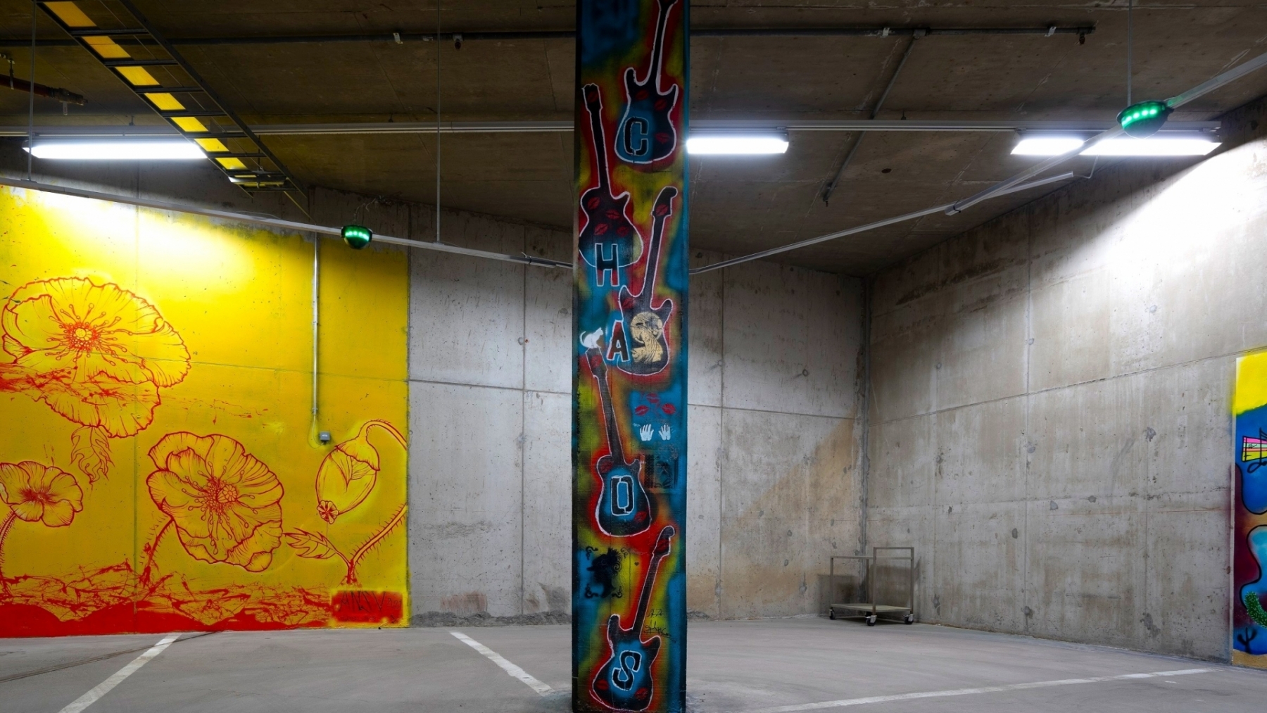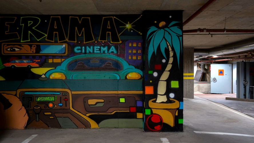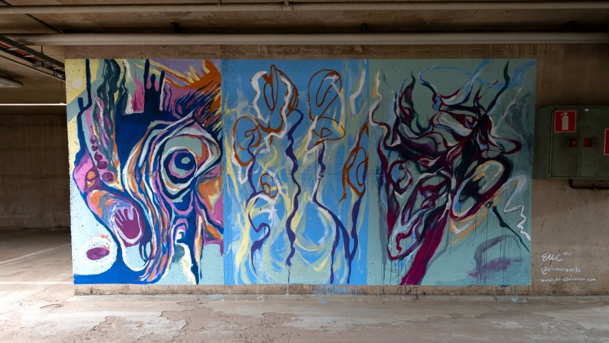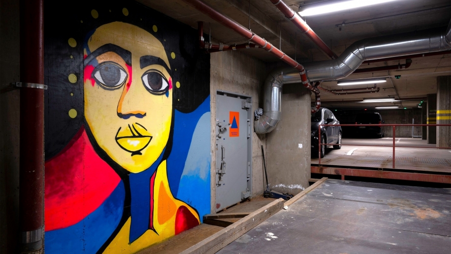 Turkulaisen graffititaiteilijan Salim Sheikhin avaruusteemainen teos ammentaa katutaiteen perinteestä ja tuo värikylläisyyttä pysäköintihalliin.