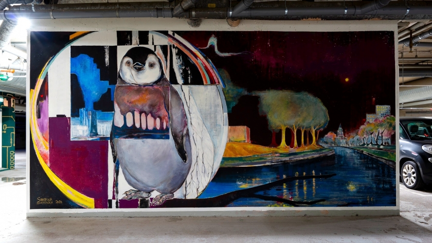 Tutunnäköinen jokimaisema ja optimistinen napapiiri-pingu tuovat elämää keskelle parkkihallia.