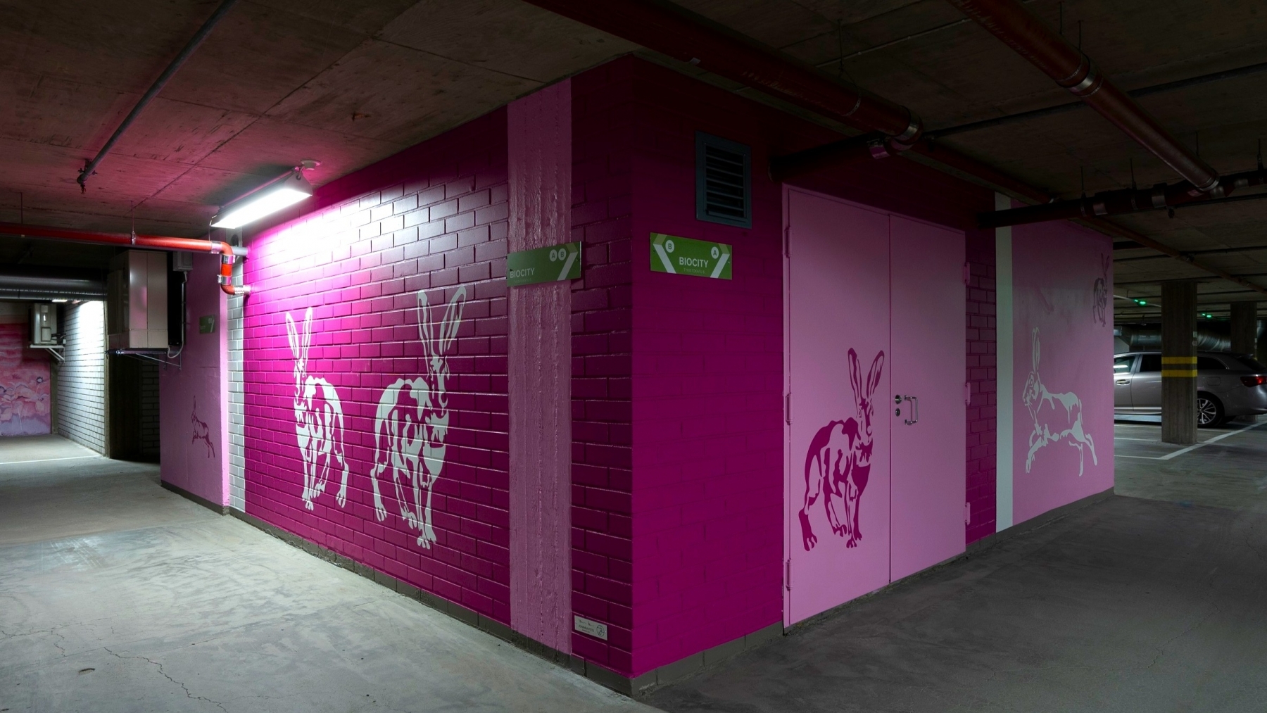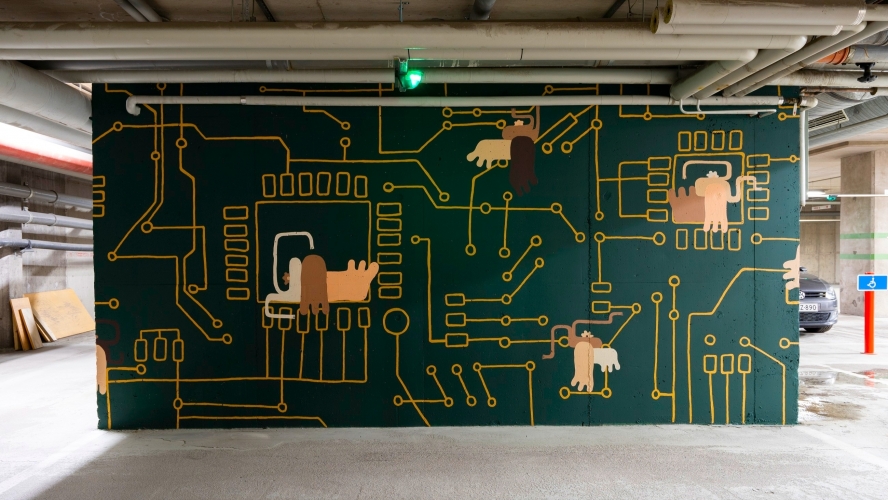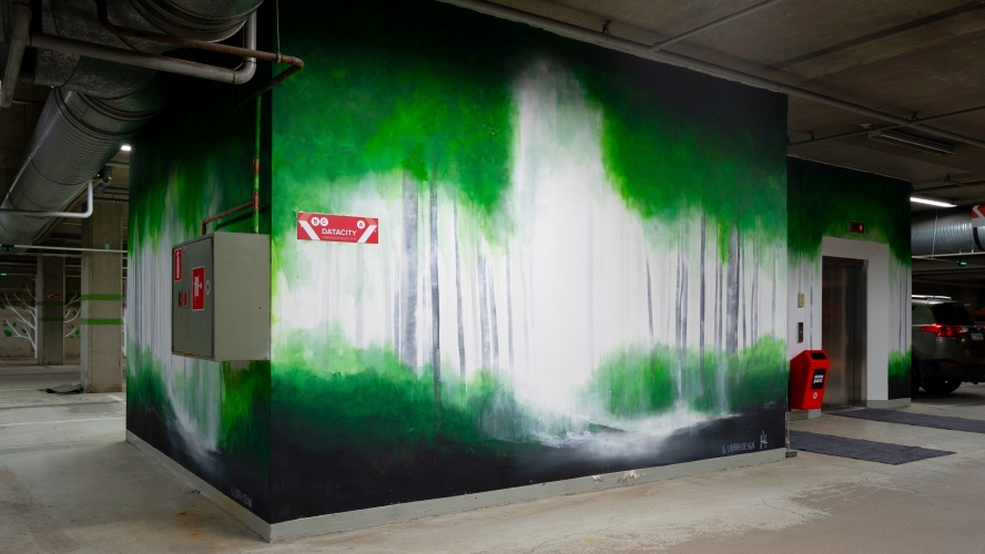 Jukka Hakasen abstraktin seinämaalauksen geometriset muodot ovat peräisin BioCityn ja DataCityn parkkihallien pohjakuvista.