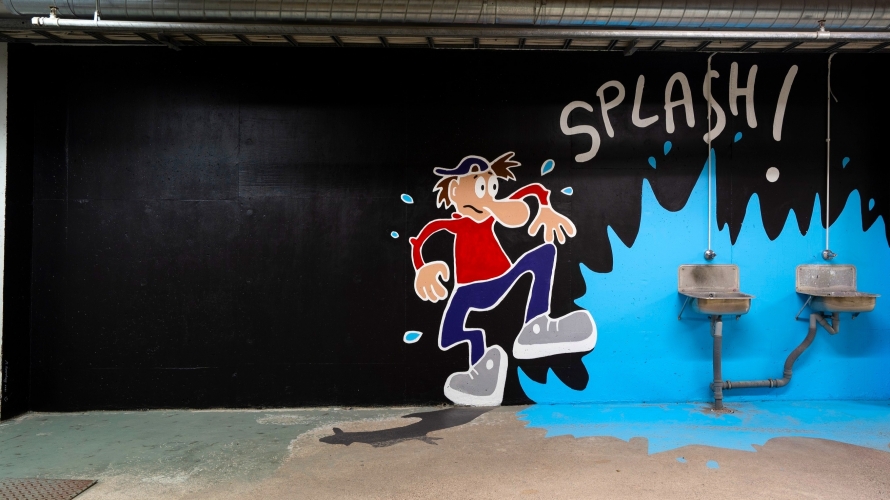 Splash!-teoksen hahmo säikähtää, kun parkkihallin vesipisteen hanat alkavat roiskia vettä.
