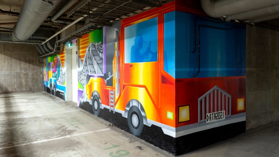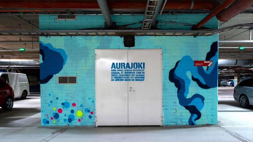 DataCityn pysäköintihallista löytyvässä seinämaalauksessa DataCity on kuvattu pirtein värein ja tyylitellyin linjoin.