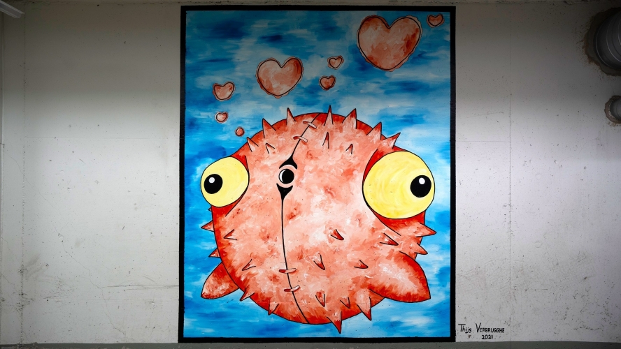 Teos kuvaa vedenalaisessa parkkihallissa uiskentelevaa fugua eli pallokalaa, joka puhaltaa veteen sydämiksi muuttuvia ilmakuplia.
