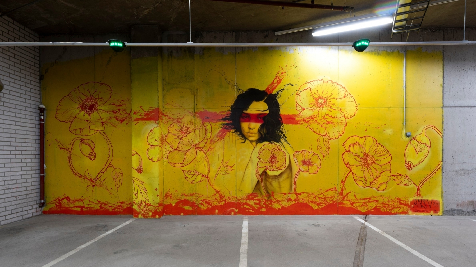 Turkulaistaiteilija Ansu Airaksen ensimmäinen seinämaalaus on kunnianosoitus kaikille taakkansa kantajille. Teoksen käsittelemä kipu näkyy punaisena raitana naishahmon silmien päällä.