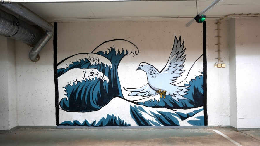 Silmälle kevyt seinämaalaus hyödyntää luonnon peruselementtejä: siinä yhdistyvät aallon voima ja kyyhkysen herkkyys. Maalaus tuo luonnon rauhaa arjen keskelle.
