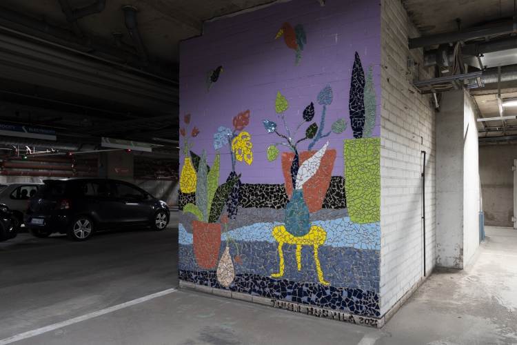 Mosaiikkipuutarha tuo ilahduttavaa piristystä parkkihallin ilmeeseen niin raikkailla väreillään, teemallaan kuin tekniikallaankin.