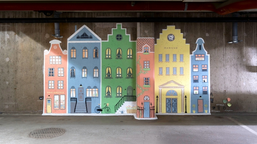 Pieni kaupunki levittäytyy parkkihallin seinälle tuoden ympäristöön iloa ja väriä. Teos kutsuu katsojaa tarkastelemaan yksityiskohtiaan lähempää.